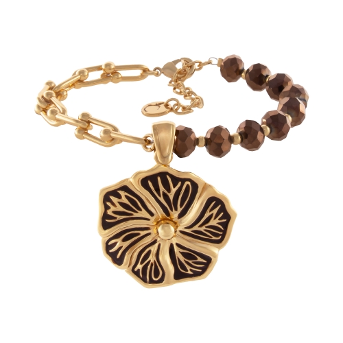 Urocza bransoletka wykonana z koralików w ciepłym, czekoladowym odcieniu. Centralnym punktem zdobienia jest wyjątkowy, ręcznie malowany kwiatuszek, który dodaje biżuterii subtelnego i artystycznego charakteru.