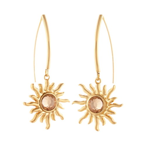Urocze kolczyki w kształcie słoneczek, których centrum zdobi lśniący kryształek. Zawieszone na dużych haczykach, pięknie kołyszą się przy ruchu, dodając blasku i lekkości każdej stylizacji. To biżuteria pełna pozytywnej energii – idealna na co dzień, jak i na specjalne okazje. Delikatne, a jednocześnie wyraziste, świetnie podkreślą Twój uśmiech i nadadzą stylizacji promiennego charakteru. Długość kolczyka 6 cm.
