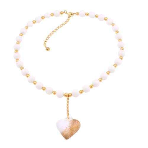 Naszyjnik pozłacany z białych agatów oraz duże serce Długość 42.0cm+7.0 regulacji. Średnica koralika 1.0cm, serce 2.8 x 3.0cm. Waga naszyjnika 48,0 g.