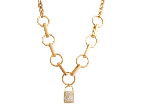 Naszyjnik pozłacany z zawieszką w postaci kłódki wysadzanej kryształkami, z logo Colibra. Długość 43,0 cm + 7,0 cm przedłużka, szerokość ogniw 0,6 -1,7 cm . Wymiary zawieszki 1,5 cm x 2,7 cm. Waga naszyjnika 52,6 g.