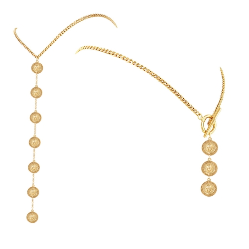 Pozłacany naszyjnik tył – przód Colibra by Sviatlana z kolekcji OLIMPIA, z greckimi monetami o średnicy 1,8 cm. Długość naszyjnika w obwodzie 40,0 cm, szerokość łańcuszka 0,4 cm, długość przodu 25 cm, długość tyłu 6 cm. Waga naszyjnika 40,7 g.