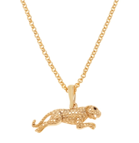 Naszyjnik z panterą. Długość naszyjnika 35cm + 7cm, grubość 0,2cm. Zawieszka 1cm x 2,8cm, grubość 0,3cm. Naszyjnik pozłacany.