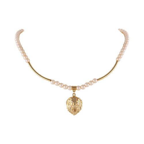 Naszyjnik z satynowych perełek z zawieszką w kształcie głowy lwa