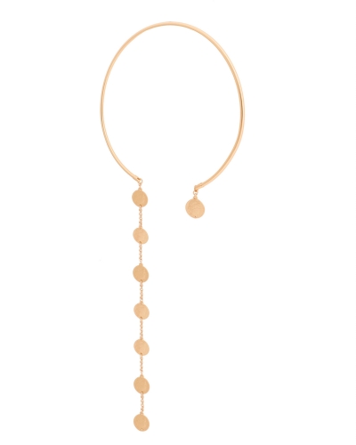 Pozłacana obroża ze spływającymi monetkami. Średnica obroży bez rozciągania 14,0 cm , szerokość 0,4 cm. Długość spływającego łańcuszka 22,5 cm, średnica monetki 1,5 cm. Waga obroży 26,0 g.