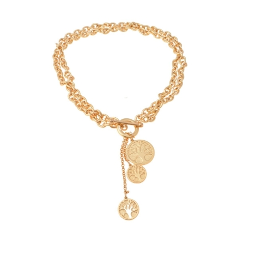 Naszyjnik wykonany z dwóch łańcuchów o długości 49 cm z trzema zawieszkami w kształcie koła z drzewkami.