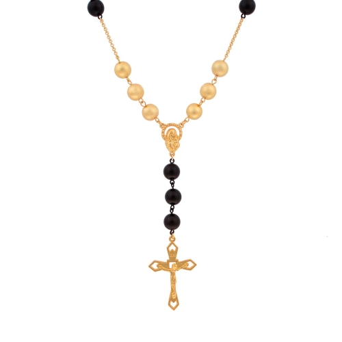 Długość naszyjnika 48 cm + 6 cm przedłużka, krzyżyk 4,5 cm x 2,8 cm. Różaniec w kolorze czarno-złotym.